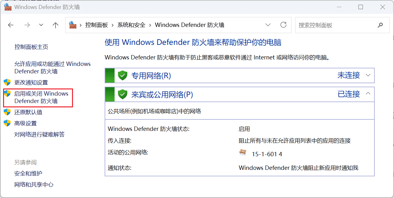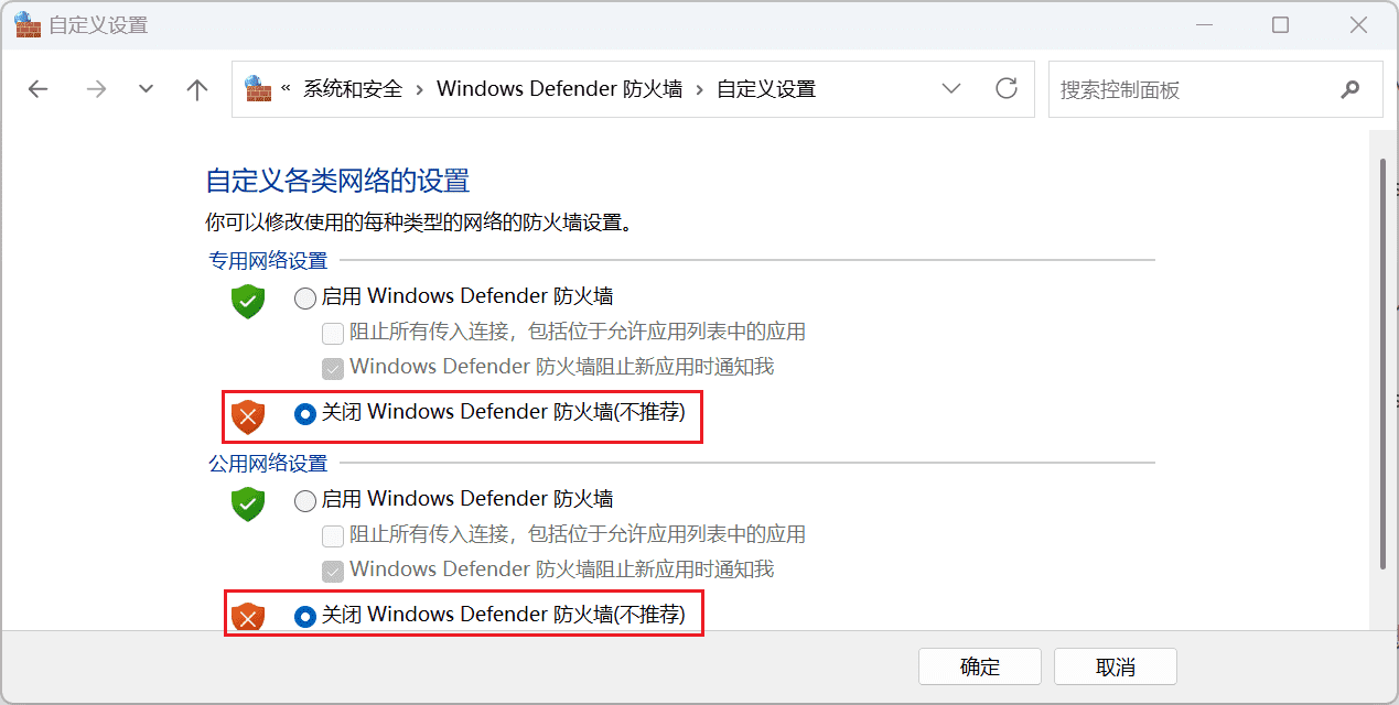 【控制面板】→【系统和安全】→【Windows Defender 防火墙】→【关闭防火墙】: