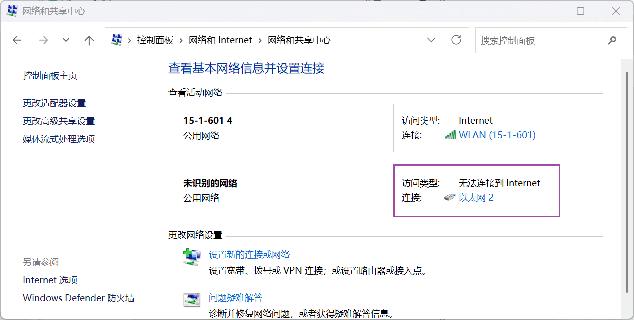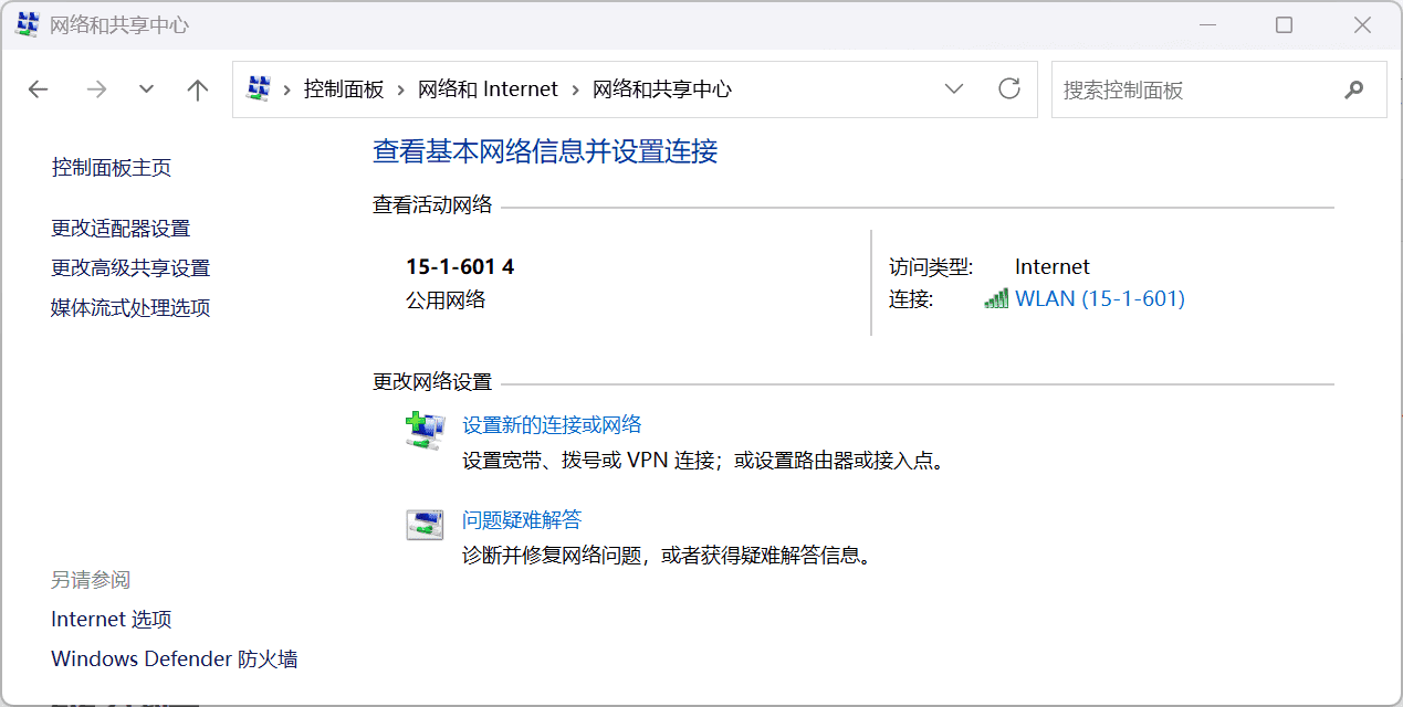 控制面板\网络和 Internet\网络和共享中心然后就会打开网络和共享中心: