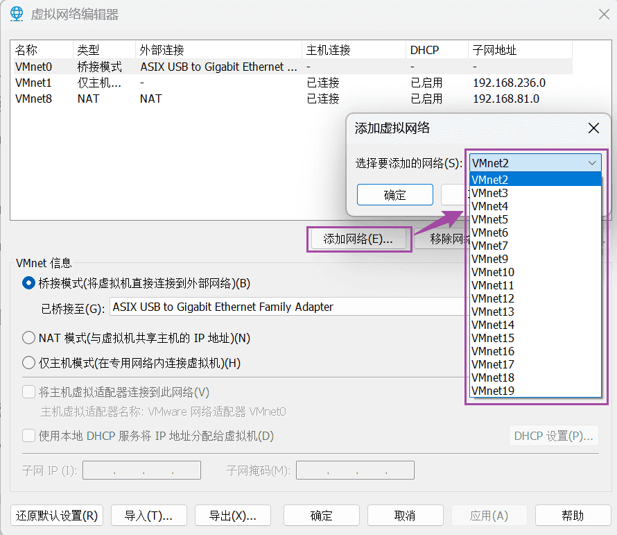 VMwear 设置:设置网络适配器为桥接模式;添加一个网络适配器 2 为 NAT 模式。