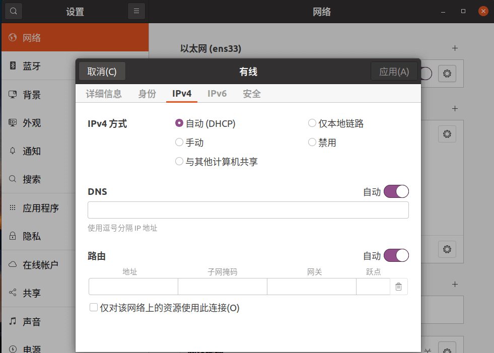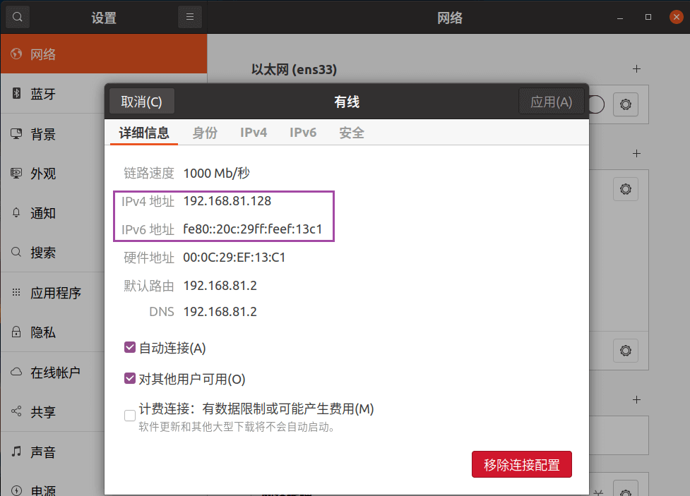Ubuntu 设置:设置 NAT 模式的网络适配器为自动获取模式(DHCP);手动设置桥接模式 的网络适配器的 IP 信息。