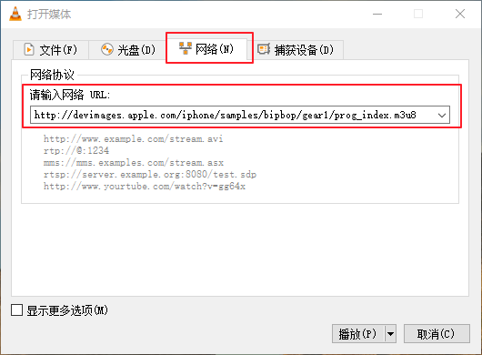 【媒体】→【打开网络串流】→【网络】→【网络协议中输入URL】,视频链接可以用下面这个: