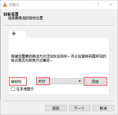 - (2)还是在【流输出面板】→【新目标】→【RTSP】→【添加】→【路径】→【下一个】→【配置文件】→【下一个】