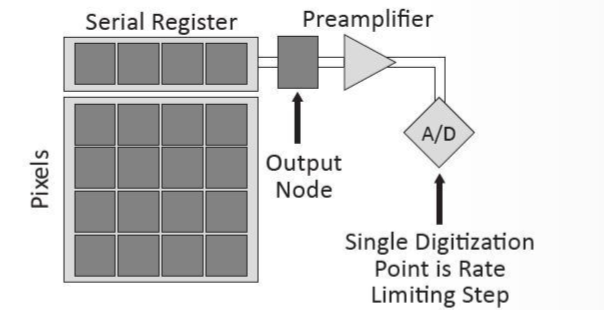 虽然这里的 ADC 只画了一个,但是真正的 CMOS SENOR 的 ADC 是有一行那么多。这和 CCD 结构有很大区别: