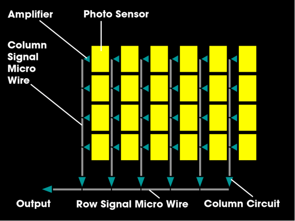 互补金属氧化物半导体设计不是传输电荷桶,而是立即将电荷转换为电压,并在微线上输出电压。