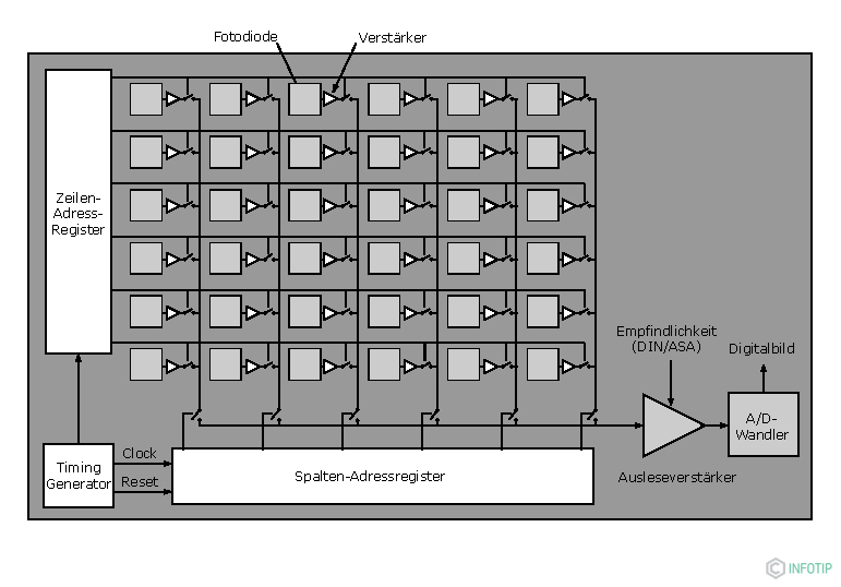 | 传输逻辑 | CCD 像元产生的电荷,需要先寄存在垂直寄存器中,然后分行传送到水平寄存器,最后单独依次测量每个像元的电荷并放大输出信号。![]() | 在每个像素上使用晶体管, 电荷通过传统导线移动, 每个像素都得到单独的处理。![]() |
