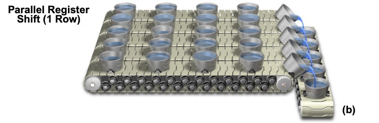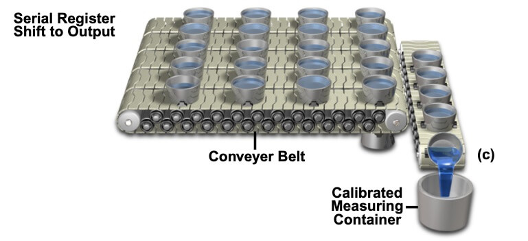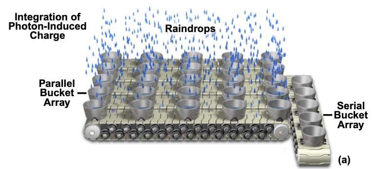 CCD 串行读出方式,可以用桶旅测量区域雨量来示意。其中落在桶阵列上的降雨强度可能因地而异,与成像传感器上的入射光子相似,如图(a)。这些桶在积分期间收集了不同数量的信号(水),桶在传送带上向代表串行寄存器(Serial Bucket Array)的一排空桶传送。在图(b),一整排存储桶被并行移动到串行寄存器的存储库中。串行移位和读出操作如图(c)所示,其中描绘了每个桶中累积的雨水被顺序转移到校准的测量容器中,这类似于 CCD 输出放大器。当串行传送带上所有容器的内容物按顺序测量完毕后,另一列并行班次(Parallel Register Shift)将下一行收集桶的内容物转移到串行记录容器中,重复该过程,直到每个桶(像素)的内容物都测量完毕。
