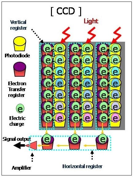 总的来说,CCD 本质上是一个大阵列的半导体“桶”,可以将传入的光子转换为电子并保持累积的电荷。这些电荷通过逐行移位传输,即可以被垂直移位寄存器,向下转移到水平移位寄存器,水平移位寄存器以将电荷转换为电压并通过放大器输出。