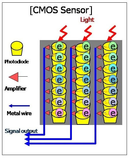 CCD 的结构就象一排排输送带上并排放满了小桶,光线就像雨滴撒入各个小桶,每个小桶就是一个像素。按下快门拍照的过程,就是按一定的顺序测量在一个短暂的时间间隔中,小桶中落进了多少“光滴”,然后逐个记录下来并放大为电信号。这个记录的过程式串行工作的,所以早期的 CCD 数码相机虽然成像质量好,但是集成度受限制,连拍速度没有 CMOS 传感器的数码相机快。