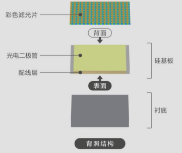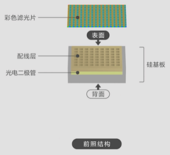 主要分为 FSI(前照式)、BSI(背照式)、堆栈式(Stack)三种,FSI(前照式)金属配线层在 CFA 和光电二极管的中间,当光线进入二极管时会有损失,BSI(背照式)则将金属配线层放在了光电二极管的下面,光线透过彩色滤波片后可直接进入到光电二极管,不仅增大了进光量,且有效抑制光线射入角变化引起的感光度下降。堆栈式(Stark)则是背照式的进一步改良,将电路区域挪到了感光元件的底部,最大化了感光区域,同时也缩小了芯片的整体面积。