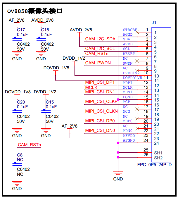 用的野火的 OV8858 摄像头模块:野火【摄像头_OV8858】模块,数据手册和电路原理图如下: