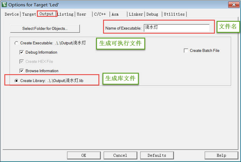 上边好像没有列出,但是可能会用到。在某些情况,我们希望提供给第三方一个可用的代码库,但不希望对方看到源码,这个时候我们就可以把工程生成lib文件(Library file)提供给对方,在MDK中可配置【Options for Target】→【Create Library】选项把工程编译成库文件,